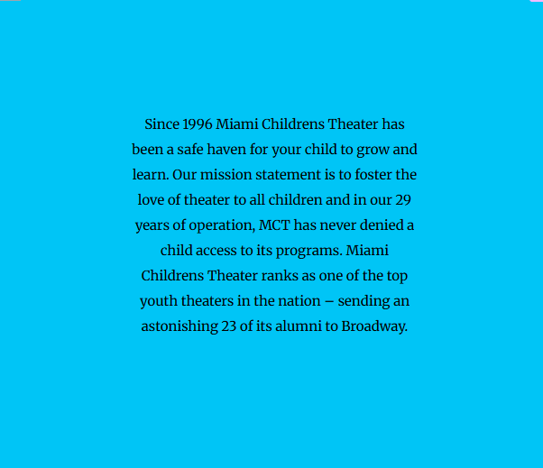 The past decade has seen Miami Childrens Theater become one of the top young persons’ theaters in the nation with 24 of its’ alumni rising to roles on Broadway. (including Ana Villafane (pictured) as Gloria Estefan in the hit Broadway musical On Your Feet. Actors trained at Miami Childrens Theater have been featured in hit Broadway shows such as Hamilton, Kinky Boots, Dear Evan Hansen, Tootsie, Cats, Sweeney Todd, Into the Woods., The Outsiders and Water for Elephants, Two significant distinctions occurred in the years 2010-2020: MCT Director Tim Fath was honored with a Tony Award Nomination for Excellence in Theater Education and Miami Childrens Theater was voted Best Overall Theater and Best Childrens Theater in Broadway World’s Regional “Best of the Decade” voting.